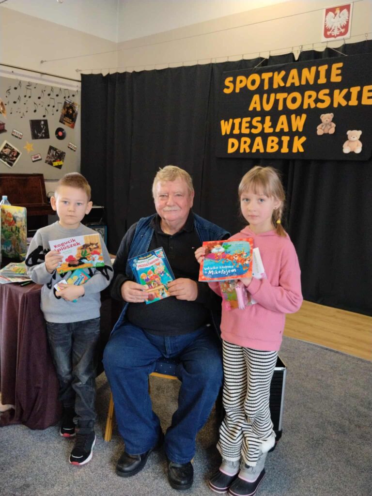 📚 Pan Wiesław Drabik oczarował najmłodszych opowieściami, pełnymi ciepła i zabawnych rymów. Dzieci z wielkim entuzjazmem słuchały czytanych wierszyków, a także chętnie odpowiadały na zagadki zadawane przez autora. Radość i uśmiechy na twarzach uczestników były najlepszym dowodem na to, jak bardzo angażujące i inspirujące było to spotkanie.